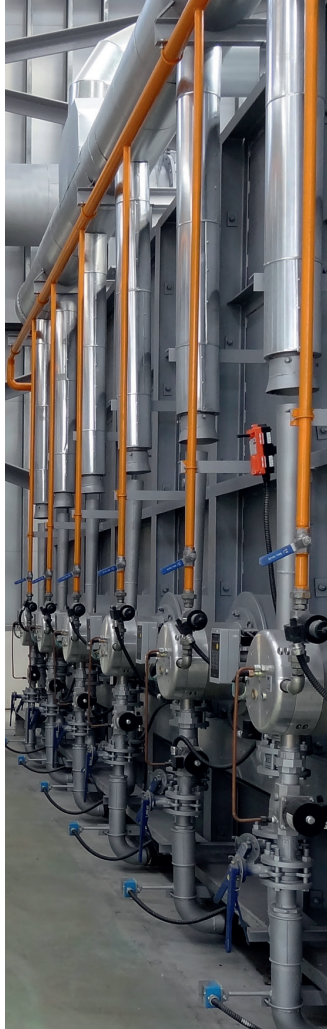 - Система нагрева для сушилок с поперечным обдувом для плит из гипсокартона. Может работать как на природном газе, так и на бутане. В системе используются встроенные горелки процессного нагревания CONEFIRE мощностью от 800 кВт до 1,5МВт.