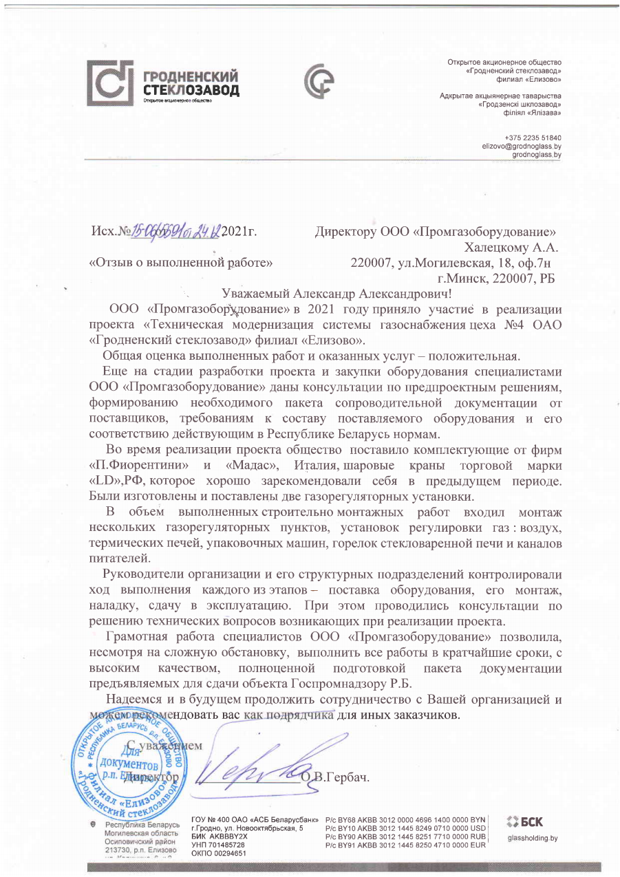 От консультаций на предпроектной стадии до строительства и запуска: в 2021 году команда инженеров и специалистов ООО "Промгазоборудование" приняла участие в проекте "Техническая модернизация системы газоснабжения цеха №4 ОАО "Гродненский стеклозавод " Филиал "Елизово". В декабре завершены все работы и объект введен в эксплуатацию.