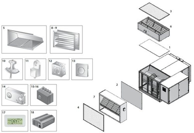 - Воздушными заслонками (8-9) из оцинкованной листовой стали, с регулируемыми направляющими для открытия/закрытия и валом для электропривода;
