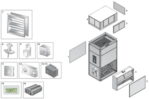 Воздухораспределитель (4) с тремя или более решетками и с одной или более панелями, в зависимости от модели. Воздухораспределитель поставляется отдельно, сборка выполняется заказчиком;